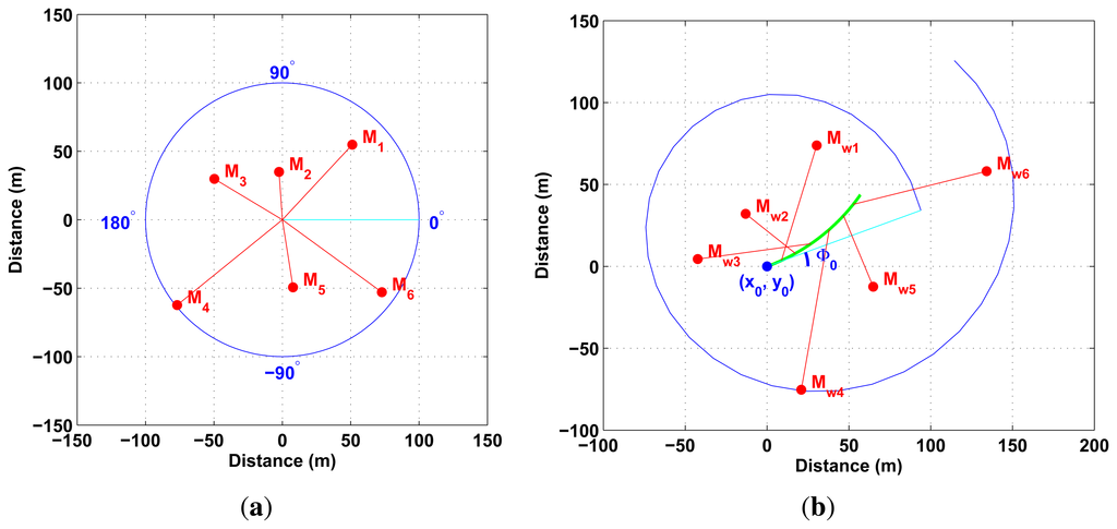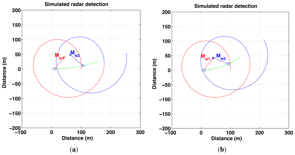 The entire set of detections in the world frame can be easily expressed in a matricial form based on Equation (8). Based on these equations we can conclude that distortion is linked to the velocity parameters (V, ω), to the landmarks in the two successive scans M1 and M2, to the initial pose of the robot (x0, ϕ0) and to the sensor scanning rate ωsensor. But, in fact, the only parameters that need to be estimated are the unknown velocities and consequently the current radar pose.