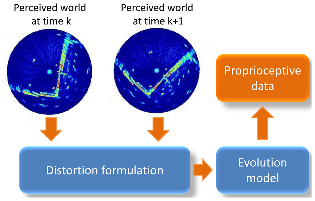 Another contribution presented in this paper is to propose a full radar-based odometry, which does not use any proprioceptive sensor but only distortion formulation and Doppler velocity analysis. The estimation of a vehicle's displacement or ego-motion is a widely studied problem in mobile robotics. Most applications are based on proprioceptive data provided by odometer sensors, gyrometers, IMU or other positioning systems such as GPS [6]. However, in order to estimate motion, some research works tried to use only exteroceptive data. Thus, Howard [7], Kitt et al. [8] and Nistér et al. [9] proposed a visual odometry without proprioceptive data. Tipaldi and Ramos [10] proposed to filter out moving objects before doing ego-motion. In such an approach, exteroceptive ego-motion is considered as intended to augment rather than replace classical proprioceptive sensors. Sometimes, classical displacement measurements are much more difficult and have limitations: inertial sensors are prone to drift, and wheel odometry is unreliable in rough terrain (wheels tend to slip and sink) and as a consequence visual odometric approaches are widely studied [11–13]. For example, in an underwater or naval environment classical ego-motion techniques are not suitable. In [14], Elkins et al. presented localization system for cooperative boats. In [15], Jenkin et al. proposed an ego-motion technique based on visual SLAM fused with IMU. In order to find displacement with exteroceptive sensors such as range finders, the scan matching method is commonly used [16–18] but each scan is corrected with proprioceptive sensors especially when the sensor is slow. In all scan matching work, distortion is taken into account but considered as a disturbance and thus corrected.