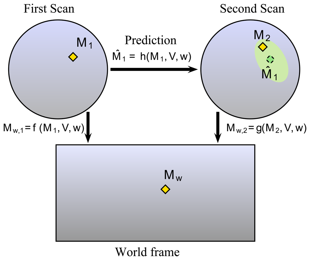 So, M1 and M2 detected in their respective scans can be propagated in the world frame by their two respective propagation functions:
