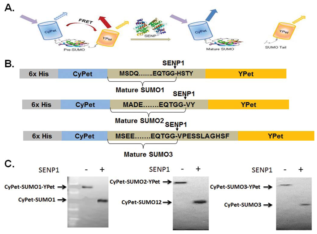 The open reading frames of the human SUMO and SENP1 genes were amplified by PCR, and the PCR products were cloned into the PCRII-TOPO vector (Life technologies, Carlsbad, CA, USA). After confirming the constructs by sequencing, the cDNAs encoding CyPet-(pre-SUMO1/2/3)-YPet, CyPet-SUMO1/2/3, YPet, and the catalytic domains of SENP1 were cloned into the pET28 (b) vector (Merck KGaA, Germany), engineered with an N-terminal 6xHistidine tag.