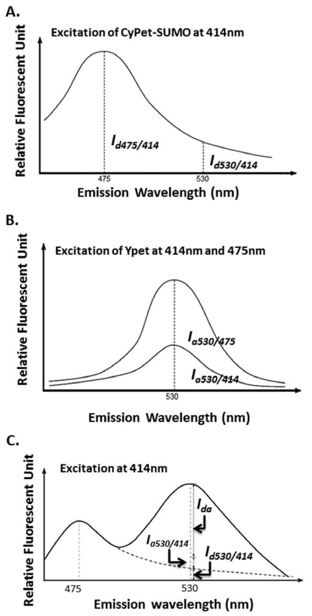 The cross-talk ratio of YPet's self-fluorescence (β) is the ratio of YPet's emission at 530 nm when excited at 414 nm (Ia530/414 and Ia as fluorescent signal intensity of acceptor) to the emission at 530 nm when excited at 475 nm (Ia530/475) (Figure 2(B)):