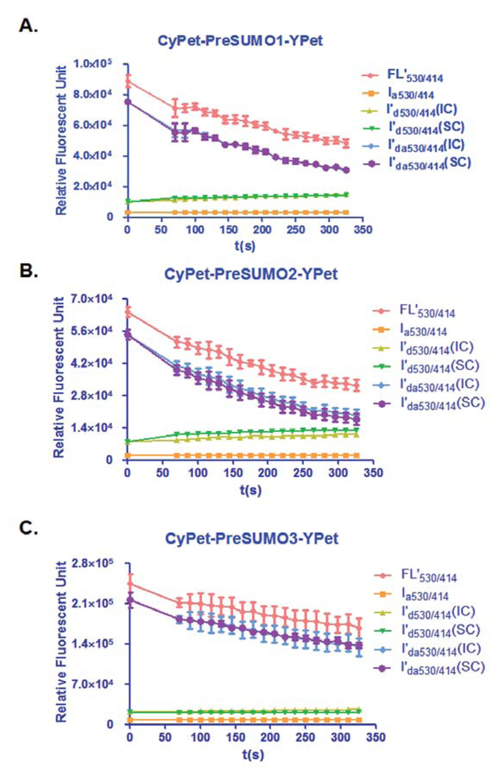After digestion by SENP1, the fluorescent signal at 530 nm decreased, and the fluorescent signal at 475 nm increased because of the disruption of FRET signal after substrate digestion. The remaining fluorescent emission at 530 nm (FL′530/414) could still be divided into a similar three components: