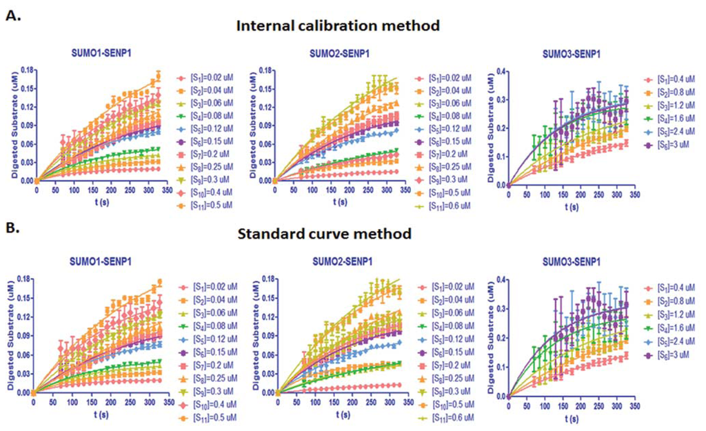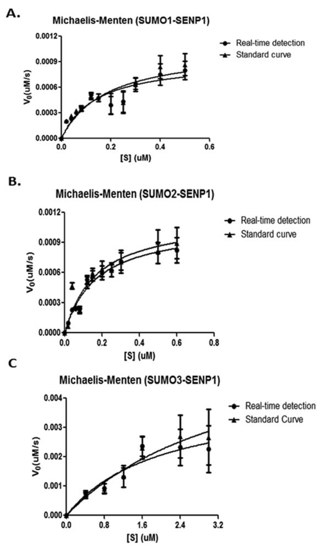 The results of initial velocity at different concentrations of substrates determined by the two methods are reported in Appendix Table A1. These results also suggest that SENP1 prefers the pre-SUMO1/2 substrates over the pre-SUMO3 substrate. The results displayed a good substrate dose-dependent relationship and showed the small differences from the above two methods.