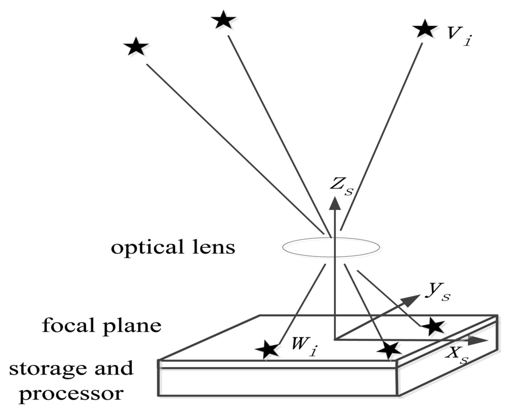 The position of the principal point of the star tracker on the image plane is (x0, y0). The position of the image point of navigation star si on the image plane is (xi, yi). The focal length of the star tracker is f. Vector wi can be expressed as follows [13]: