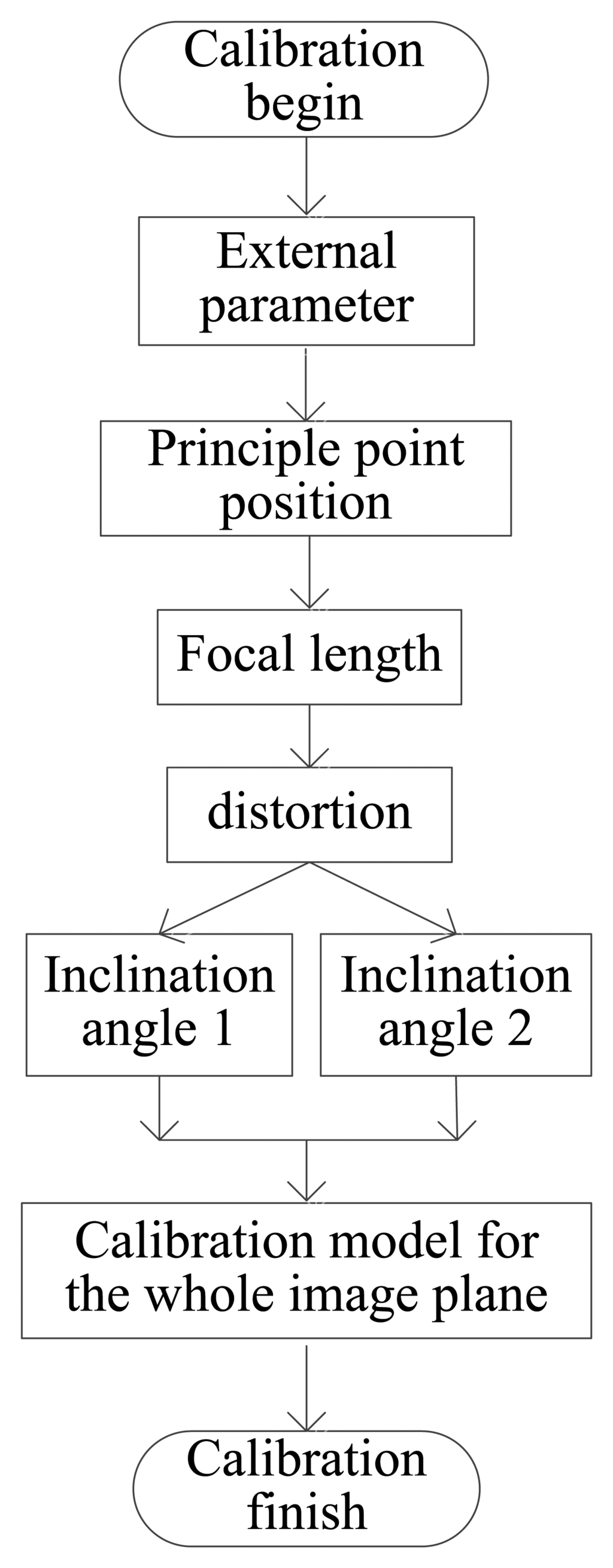 According to the analysis in Section 3, the calibration objective should be focused on the inclination of the image plane and the distortion. The basic block diagram of the calibration process is shown in Figure 10.
