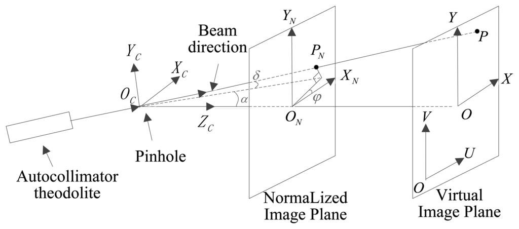 For better representation of the location and the relationship, we create the coordinate systems as in Figure 11. Axes XC YC in coordinate system CSC represent the movement directions of the outgoing light rays of the theodolite in the two orthogonal axes, respectively. ZC, XC and YC comply with the right-hand rule. Coordinate system CSN represents the normalized coordinate of the focal plane. The positive directions of XC YC are consistent with the directions of the increase in the image pixel value. The coordinate origin is the same as the optical system principal point. The distance between CSN and the pinhole is normalized to one. Coordinate system CSOXY has the same direction as that of CSN, and the only difference is that the distance between CSOXY and the pinhole is equal to the focal length f. CSOUV represents the actual coordinate system of the image plane. The positive directions of u, v are consistent with the directions of the increase in the image pixel value. The coordinate origin is at the zero pixel of the image plane, and the optical system principal point can be expressed as (u0, v0). The distance between CSOUV and the pinhole is f. The axes of CSO′U′V′ and CSOUV have the same direction, with the coordinate origin O′ is the same as the principal point. Ideally, CSO′U′V′ coincides with CSOXY. Angle α is the longitude value of the outgoing light ray of theodolite in coordinate system CSC, whereas δ is the latitude value. Angle φ is the angle between the axis XC and axis XN. Thus, the coordinates of the ideal pinhole imaging model are established as shown in Figure 11. The relationship of the parameters are presented in Equations (9)–(11).