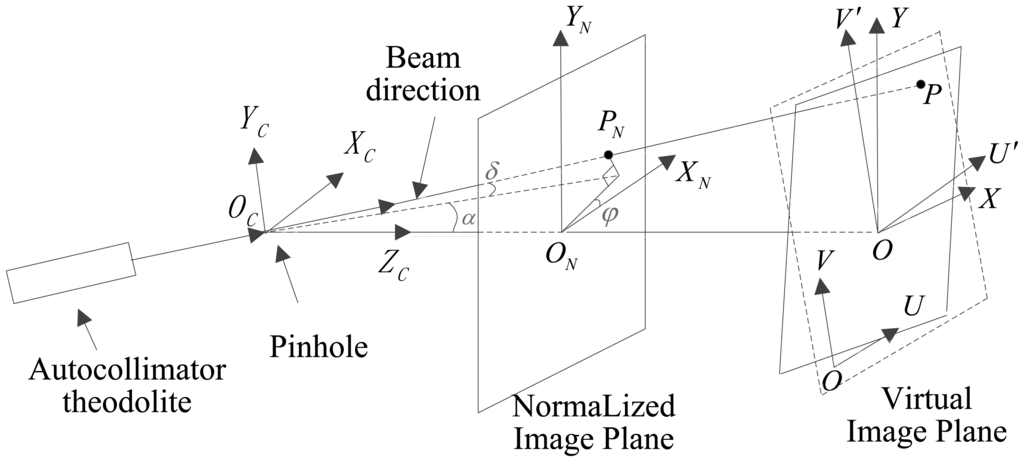 Angle α is positive along the positive direction of XC, whereas it is negative along the negative direction of XC. Angle δ is positive along the positive direction of YC, whereas it is negative along the negative direction of YC. When the angle from XN to XC is counterclockwise, angle φ is considered as positive. The ideal pinhole imaging model cannot be achieved in practical application. There are position errors of principal point, focal length error, inclination of image plane and distortion to cause the CSO′U′V′ departure from CSOXY as shown in Figure 12, and the equations above are invalid. It is necessary to estimate the parameters by calibration.