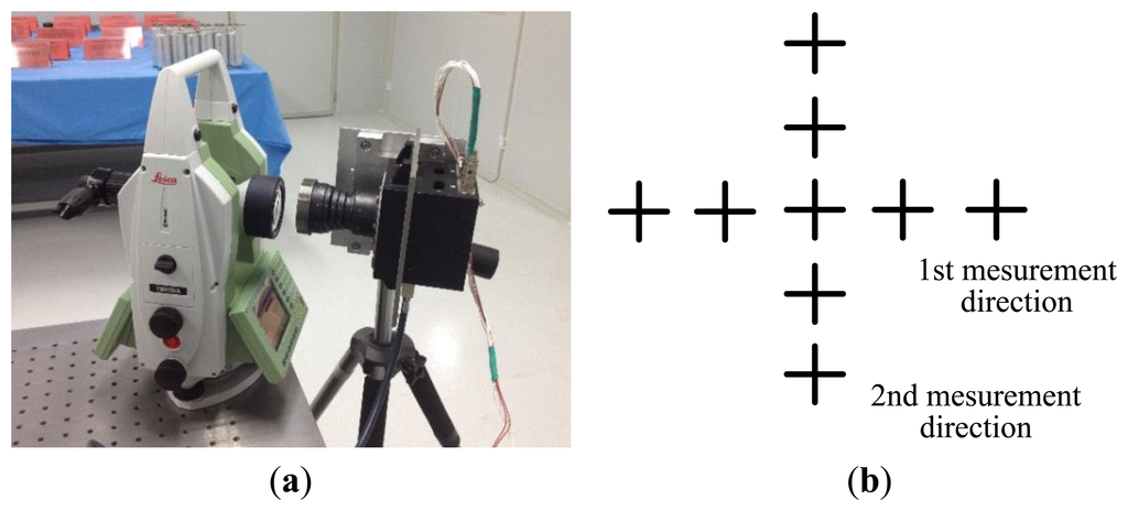 The calibration experiment is conducted in the laboratory. From the above analysis, we can know the longitude angle αi and latitude angle δi of the incident ray of the theodolite. We also can obtain the position of point as PRi+ or PRi− by the image processing mentioned in Section 4.2.3. Then we do the same procedure as Section 4.2.4.3, and calculate the position of point GIi+. The position of point PIi+ can be also obtained through Equations (9)–(11). Comparing the two positions, the calibration model is proved to be effective and adequate if the error between the two positions is less than the ξP for points on the image plane at any incident light angle. In the experiment, we conduct two orthogonal direction measurements to get the parameters and the calibration model. Then we conducted measurements in another two independent and orthogonal directions that have an angle of 45° or 135° with the 1st measurement direction L1 to prove the analysis and calibration model in this paper.