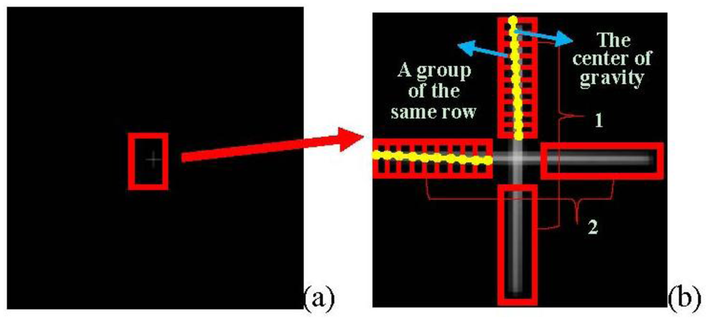 The image obtained by the star tracker is shown in Figure 14. An appropriate image processing method should be adopted to obtain the precise center position of the crossline which represents the outgoing ray of the theodolite. For the pixels in the first area, we regard the pixels in the same row as a group, and determine their gray value center of gravity (i.e., weighted average). For the pixels in the second area, we consider pixels in the same column as a group, and also determine their gray value center. The centers of gravity are marked with a circle as shown in Figure 15. Finally, we use the least square method to fit the two straight lines. The point of intersection of the two lines is considered as the center of the crossline. This work provides a basis for further algorithm. Since the light intensity of the theodolite could be adjusted by a knob, obtaining image before experiment and observing whether the image is saturation is also important.