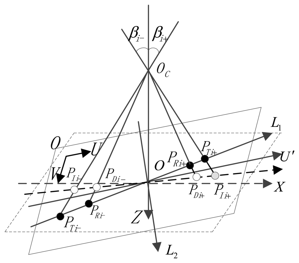 The positions of the series of specific points are obtained according to the above discussion and preparation. The characteristics of these points include the following: the test points are distributed in two orthogonal directions and the test points in the same direction are almost centrosymmetrical. Taking advantage of relationship between the symmetric points, we build a calibration model, shown in Figure 16. In the actual calibration process, we try to make one of α, δ equal to zero for simplicity of the calculation. In reality, no restriction is imposed on the theodolite longitude and latitude angle, and the two orthogonal directions formed by the test points do not necessarily coincide with any of the defined coordinates. For the general situation, we name the two orthogonal directions distributed with the test points as L1 and L2. βi is the synthesis angle of the theodolite longitude and latitude. When there are distortion and inclination of the image plane in the system, the imaging model is shown in Figure 16. βi+ and βi− respectively represent the incident angles of the two centrosymmetric points in the same test direction. PIi+ and PIi− are the ideal image point positions corresponding to the incident light rays when no distortion and inclination of image plane occurs. PDi+ and PDi− are the positions of the image points when distortion is present but with no inclination of the image plane. PTi+ and PTi− are the positions of the image points with the presence of image plane inclination but with no distortion. PRi+ and PRi− are the positions of the image points when both distortion and inclination of the image plane are present.