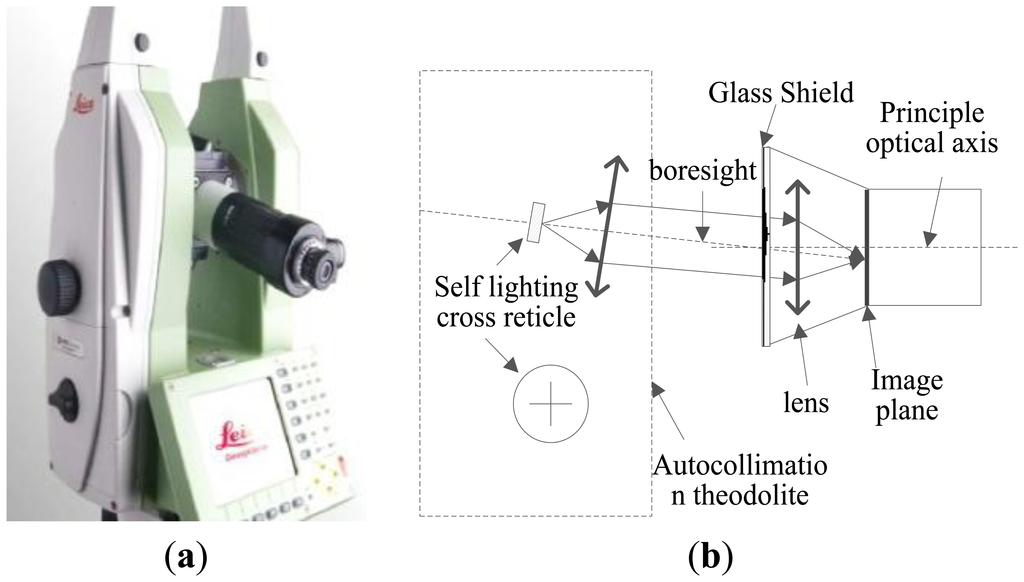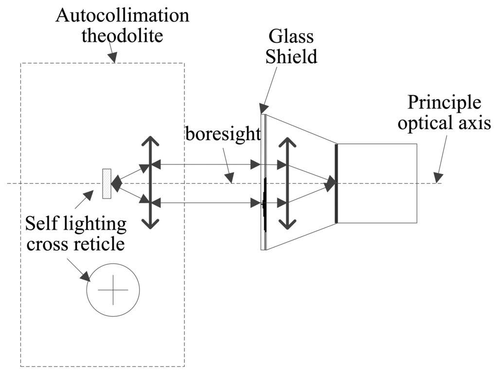 The calibration object of this paper is a star tracker with 7″ accuracy. Based on the result of the above analysis, optical parameters of the system are calibrated. The laboratory calibration of the star tracker can be performed using a three-axis turntable and a collimator or an autocollimator theodolite. In essence, their operating principle is the same. However, because the collimator does not have a self-collimation function, which could introduce trouble to the calibration of the principal point, we adopt the autocollimator theodolite.