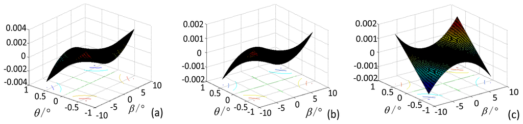 Figure 19. Relationship of the different distortion expressions. Z-axis of (a) represents (|PTi−PRi−| − |PTi+PRi+|)/pixel; Z-axis of (b) represents (|PTi−PRi−| − |PIi−PDi−|)/pixel; Z-axis of (c) represents (|PTi+PRi+| − |PIi−PDi−|)/pixel.From the multiple groups of symmetrical points, we can obtain optimized distortion coefficients a1, a2, a3, a4, a5 by linear least-squares fitting. The form of distortion can be chosen according to the distortion values in different cases. Here we adopt :