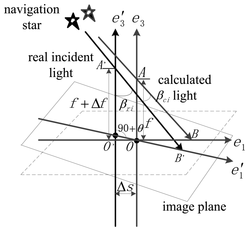 Figure 2 shows the sketch of complete error propagation. βri is defined as the angle between the incident ray and the optical axis. The initial value of βri is βr0, βr0 =0°. The maximum value of βri is equal to the angle of the FOV. Δβri is the ξAR, and Δβri = βri − βr0. βci is the angle between the calculated light and the optical axis. Δβci is the ξAC, and Δβci = βci − βc0. We made the following assumptions: axis e1 is along the direction of the maximum error of the principal point, and the inclination angle of the image plane in this direction is also the maximum of all directions. This can represent the worst case of error conditions. Axis e3 is the ideal optical axis of the system, and e′3 represents the actual optical axis. Δs represents the deviation of the optical axis. Δf is the deviation of the focal length. Δx represents the star point-extraction error and Δd is the distortion value. The distortion discussed in this paper concerns radial distortion only.