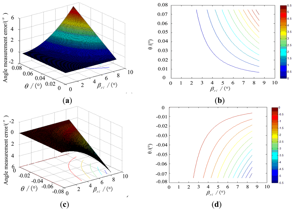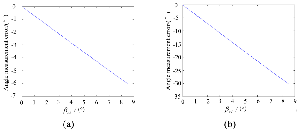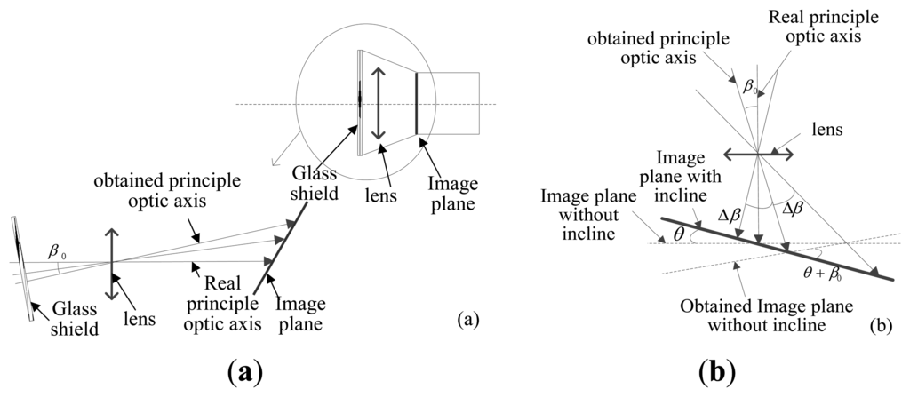 In the calibration process described in Section 4.2.4.2, the principal point position is obtained and considered as its true position. In reality however, due to lens installation, accuracy in manufacture as well as the limitations in the eyepiece alignment when using the theodolite, a deviation error of the optical axis is inevitable. That is to say, there may be an error β0 between the optical axis obtained in Section 4.2.4.2 and the true optical axis of the lens. Maximum value of β0 is approximately 40″ in this calibration system, consisting of 30″ installation error of the lens and 10″ eyepiece alignment error. In this situation, the optical axis error will cause the deviation error of principal point, the focal length and inclination angle. The specific effect analysis is described as follows: