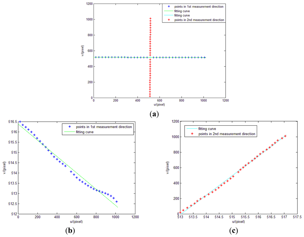 Figure 21. Measurement points and linear fitting curve (a). (b) and (c) show the two fitting curves separately.Solving the slope of the line can determine the value of φ. In our experiment, the slope of the two lines are −0.003968 and 0.003949, and root mean squared errors (RMSE) are 0.1614 and 0.0576 pixels. So the values of φ are 0.2273° and 0.2263°. We adopt 0.2268° as the value of φ.