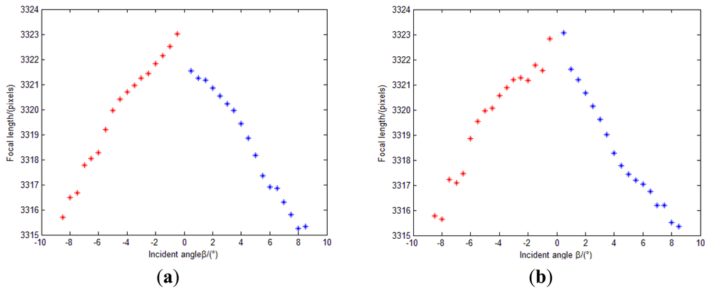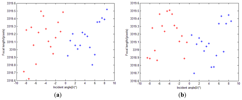 Figure 22. Estimations of f. (a) is the result of 1st measurement direction L1, and (b) is the result of 2nd measurement direction L2. Points in red and in blue represent centrosymmetry incident light rays separately.Theoretically, the values of the calculated focal lengths are equal. However, distortion can cause departure of the calculated focal lengths in different incident angles. Inclination of the image plane may cause deviation even when points are in centrosymmetry incident angles. Therefore, the estimations of f in Figure 22 is reasonable. We determine the focal length of the system as 3319.15 pixels using Equation (14). An initial estimate of f is adequate for calibration model as long as the radial distortion and other calibration parameters are matched with it.