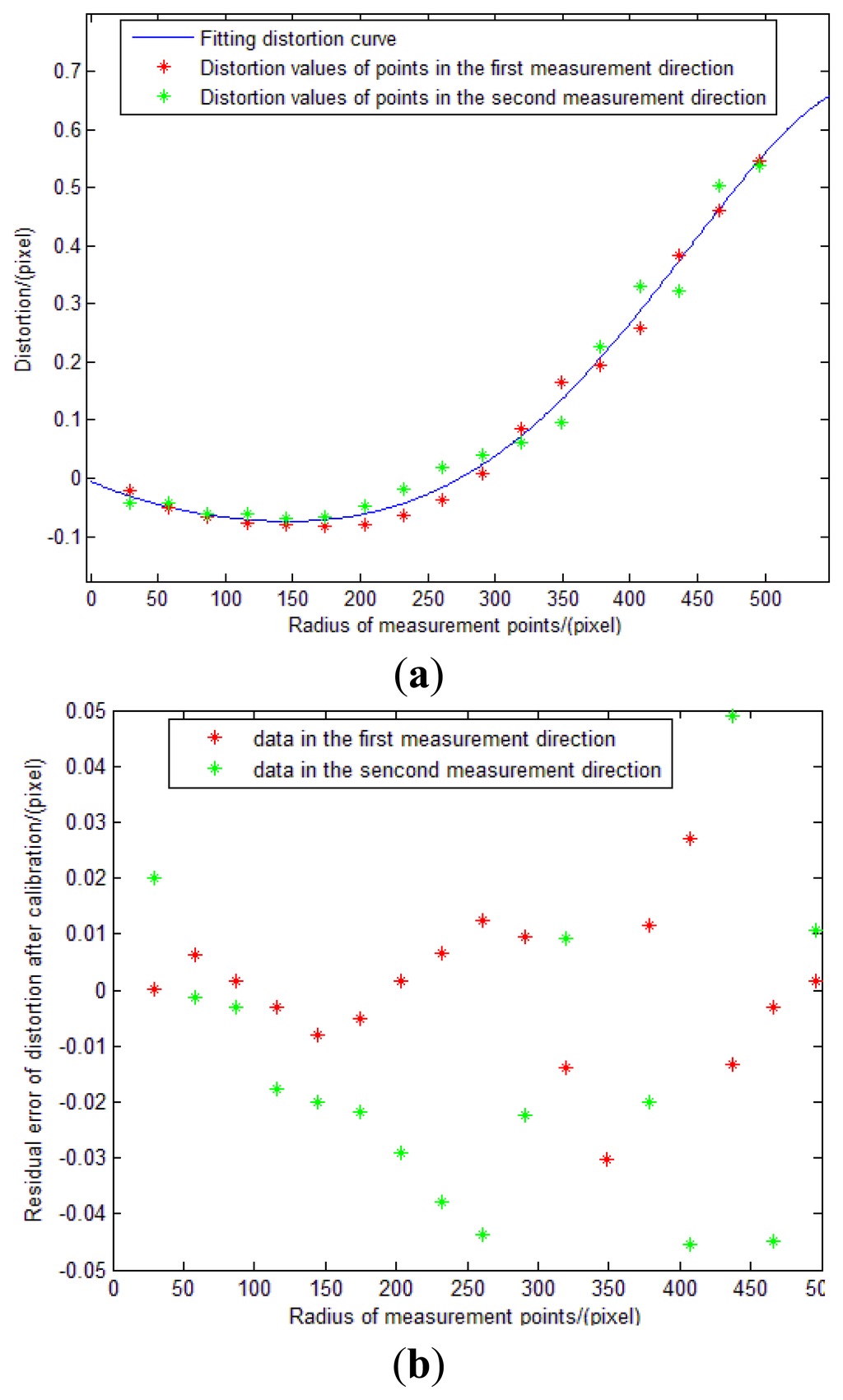 Figure 23. Distortion curve. (a) is fitting distortion curve and (b) is residual errors of distortion after calibration.
