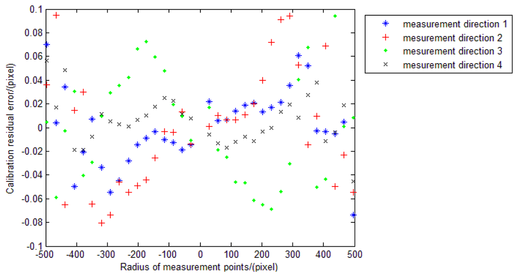 After calibration, we can obtain the calibrated image point position of the incident light in different directions. The estimations of f can be conducted again to show the effect of the calibration (Figure 24) compared to the initial values in Figure 22. We can see from Figure 24 that the values of focal length do not change with the incident angles any more. They are in a range of 1 pixels (standard deviation ≈0.23 pixels). This can also demonstrate that the residual errors are improved after calibration. The position error between points GIi+ and PIi+ is shown in Figure 25.