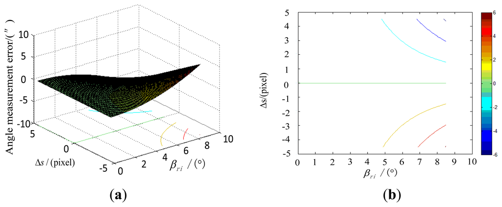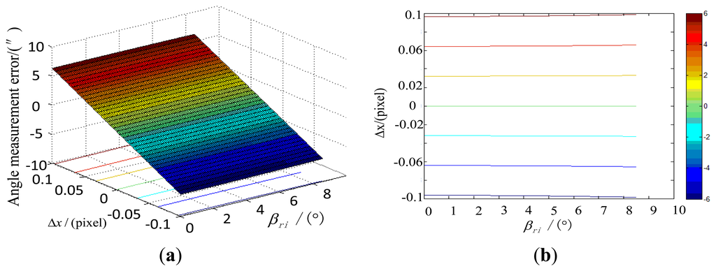 We conduct a simulation using Maximum Error Method to compare with the method in Section 3.3.1 based on the error propagation model in Section 3.2 and the system parameters of the star tracker, as well as the range of the star point extraction error, the principal point error, focal length error, inclination of the image plane and distortion. The incident angle βri is in the range of 0–8.5° and the focal length is approximately 49.74 mm. Under the simulation conditions, the effect of the error of star point extraction on the star tracker accuracy, along with the incident angle is shown in Figure 4.