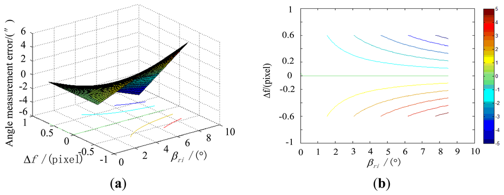 Under the simulation conditions, the effect of the error of focal length on the star tracker accuracy, along with the incident angle is shown in Figure 6.