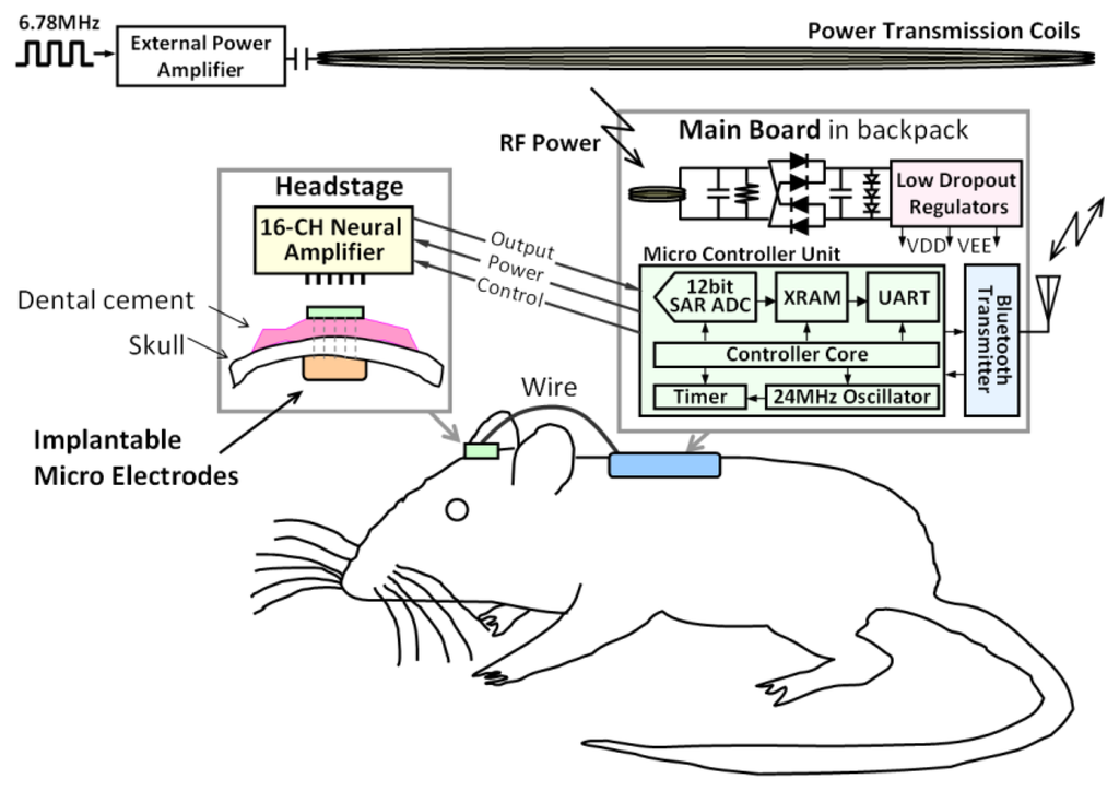 Neuroscience engineering together with biomedical devices for neural recording in the central nervous system are widely viewed as a promising path to revolutionary progress in understanding neural functions and for the realization of practical neural prostheses. Also, long-tem, real-time and stable observation of the monitoring target for treating disorders such as seizures, as well as for rehabilitative prosthesis is required for these biomedical device designs that can simultaneously record neural signals from a large number of electrodes in awake animals [1]. Due to the small size of laboratory rats, a miniature, lightweight, wireless, implantable microsystem is the key solution to capture accurate biological signals from an untethered animal in its natural habitat [2,3]. Generally, wire connections are required for powering and data transmission. Use of wire connection between animals and instrumentation can cause serious problem, and even lead to the death of implanted animals when wire drag happens. Swivels are used to solve the dragging problem, but the area of movement is still limited and the price can be another problem. Additionally, channel numbers are limited and the implanted laboratory animal still cannot behave in their nature condition because of the wires. Benefitting from rapid developments in wireless communication, various wireless solutions including Zigbee [4] and Bluetooth [5], have been commercialized and applied in animal studies. Batteries are commonly used to eliminate the problem of power wires but they dominate the size and the cost of the implant device and become less attractive when the implant devices get smaller and one needs to occasionally replace their batteries [6]. Therefore, the demand for developing continuous long-term monitoring in free-behavior implanted animals is then highly desirable.