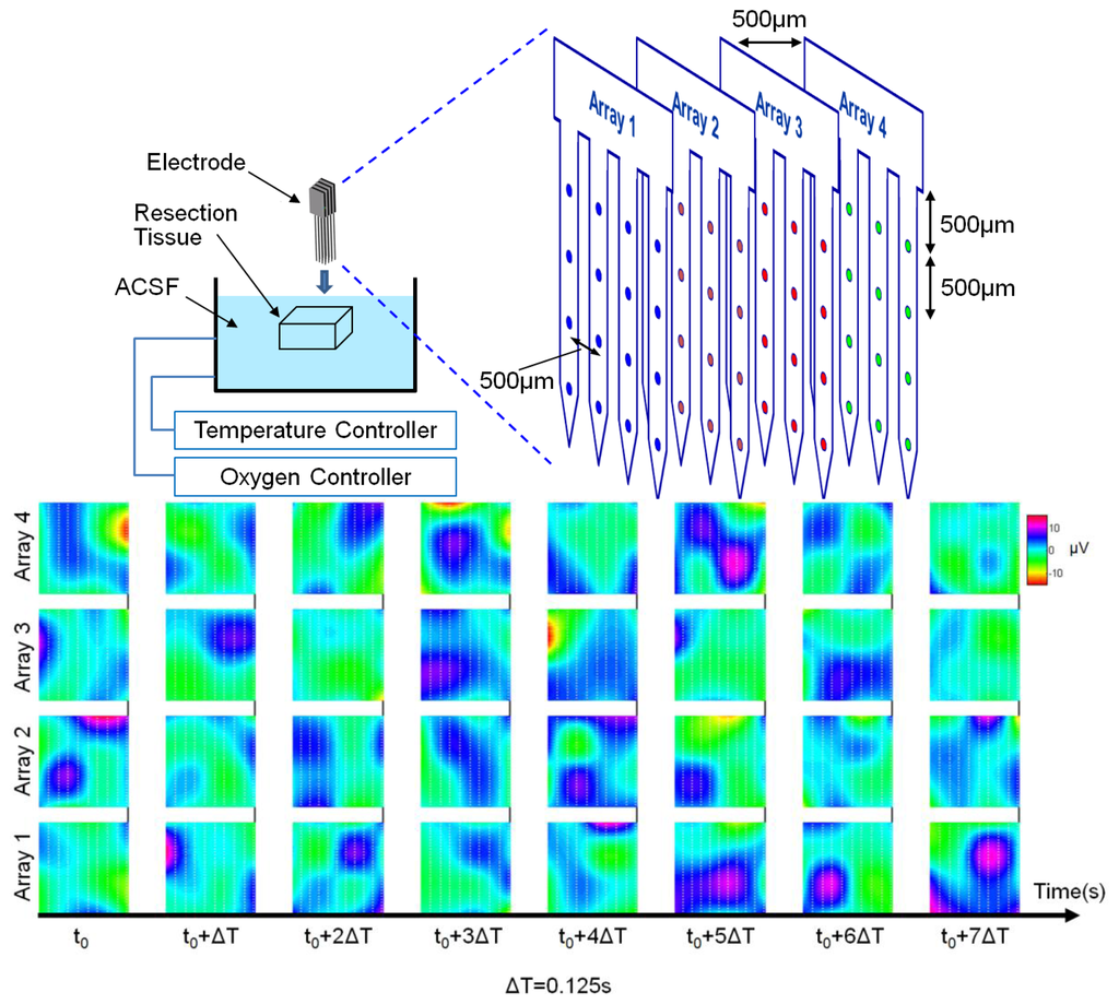 Next, real 3D neural signal propagation observation in human cerebral resection cortex layers is achieved by practical implantation after resection surgery in cooperation with the Buddhist Tzu-Chi Hospital in Hua-Lien City, Taiwan. All the study procedures follow the IRB rule of Buddhist Tzu-Chi Hospital. A patient suffering from epilepsy seizures needed surgery resection treatment. After the resection surgery, the tissue was put into a prepared artificial cerebrospinal fluid (ACSF) solution in a water bath with 37 °C temperature control and oxygen supply to keep it alive. Usually the neural activity in resection tissue can last for about 2 hour in the solution. The fabricated 3D probe array was inserted into the brain tissue by a manual 3-axis moving stage. From the recording, we can build a 3D distributed spatial signal plot. Figure 10 illustrates the reconstructed 3D near-field potential distribution recorded by 3D probe array in brain, which allows further studies for event-related observation.