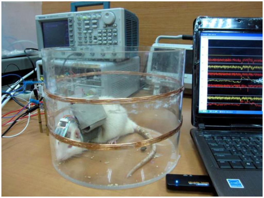 Finally, the present microsystem platform was applied to the recording of pentylenetetrazole (PZT)-induced seizures in rat [27]. Figure 11 shows the photograph of the environment setup. The main board is carried by the backpack on the rat. RF power is generated by a function generator and sent into a customized power amplifier. Power transmission coils connected to the power amplifier are located on the walls of the cage. Recorded data is transferred to a laptop via Bluetooth transmission. Customized Windows-based software provides continuous monitoring and data storage on the laptop.