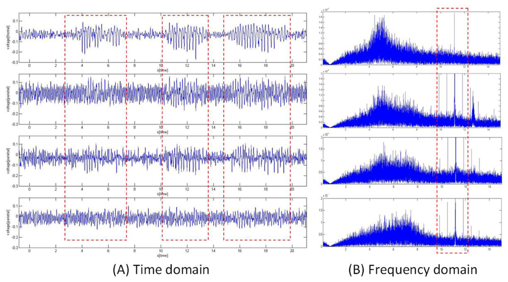 From Figure 12(A), it is clear that significant SWD can be found in the frontal zone, and its magnitude is decreased as the recording location is further from the frontal due to the fact that PZT-induced seizures mainly occur in the frontal. Figure 12(B) illustrates the frequency analysis of the recorded data, obvious peaks can be observed in the frequency range of 8–12 Hz which is the main seizure component range.