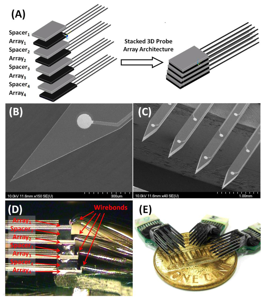 To access the full cell activity that originates in the target tissue, three dimensional distributed electrode arrays are required to achieve the recording and mapping of the neural signal network in the brain structure, which would be impossible to achieve by using 2-D planar arrays [12,13]. The stacking method for three-dimensional neural probe arrays creates 3-D probe arrays by assembling 2-D arrays and spacers layer by layer. As shown in Figure 2(A), for a 4 × 4 3-D array, four 2-D arrays with four probes in each array and three spacers were required. Figure 2(B,C) shows microphotography images of the 2D arrays. Each 2-D array can be wire-bonded individually. Therefore, perpendicular bonding pads [14], folded structure with complex assembly [15,16] method are no longer needed. After the 2D parts were fabricated, a flip-chip bonder and thermosetting polymer were used in the assembly process. Convenient flip-chip technology was employed to accomplish the alignment, pressurization and heating process, while the thermosetting polymer provided an adhesive layer between two stacked layers. The thermosetting glue solidified at 185 °C in 180 s with an adhesive strength of 150–180 kg/cm3. The maximal placement accuracy of the flip-chip was 0.5 μm in a single bonding step. The average assembly time for a 4 × 4 3D microprobe array by manual alignment was approximately 35 minutes, including heat curing time. Figure 2(D) shows the side view of wire bonding from each level of the array. Note that the thermosetting polymer layer is hidden between stacked layers therefore may not be visible. Figure 2(E) displays a photograph of the fabricated and assembled 3-dimensional probe array consisting of 16 silicon shafts with 3D distributed platinum recording sites on a one cent coin. The recording site is 100 μm in diameter and narrow tip is about 23°.