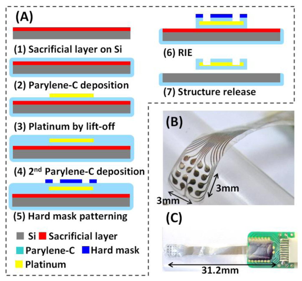 Figure 3 illustrates the proposed fabrication process flow: (1) sacrificial layer deposition on the substrate; (2) Parylene-C deposition using CVD technique; (3) platinum electrode and interconnection wire definition using lift-off technique; (4) 2nd Parylene-C deposition; (5) hard mask patterning for grid electrode array shape definition; (6) dry etching Parylene-C; (7) structure release by washing the sacrificial layer material. Figure 3(B) shows a close-up view of the recording electrode array. Parylene-C shows its transparency propertiesy in Figure 3(C). The grid electrode array is packaged on a pre-designed PCB with a connector to be linked to the headstage. The grid array is 31.2 mm in length, 4.3 mm in width, and approximately 12 μm in thickness. A total 1 of 16 platinum electrodes are fabricated with 500 μm in diameter, 750 μm in pitch. The width of the routing wire is 100 μm.