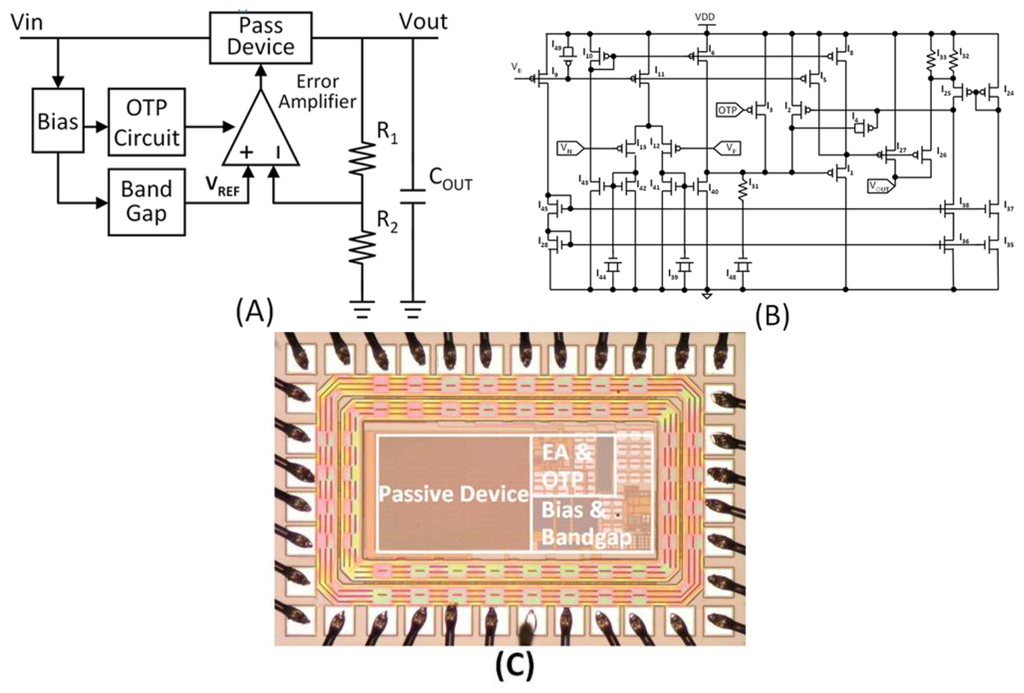 Figure 4(A) illustrates the block diagram of the low-dropout linear regulator. The architecture is modified from a typical low-dropout regulator topology with power MOSFET and OTP to enhance the driving current and avoid temperature damage to tissue [25]. The error amplifier amplifies the voltage difference between the reference voltage and divided load voltage and switches the power MOSFET (PMOS). Figure 4(B) shows the schematic of the error amplifier. MI27 is the power MOSFET illustrated in Figure 4(A). The over-temperature protection (OTP) design is used to avoid thermal damage to tissues due to the high temperature (>40 °C) caused by the operating circuit. The OTP concept is realized by ROND resistor in tsmc 0.35 μm process. Hysteresis functions when temperature is higher than 40 °C, the power MOSFET turns off; when temperature drop down lower than 37 °C, OTP pull high to open the power MOSFET again. Figure 4(C) shows the optical microphotograph of the fabricated LDO regulator chip via a TSMC 0.35 μm 2P4M process. The die size is 1.42 × 0.95 mm2.
