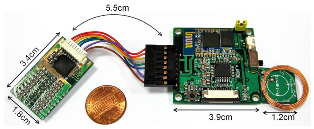 The front side of the main board consists of an MCU (C8051F58, Sliconlab Inc.) and wireless Bluetooth transceiver (BTM-192, Rayson Inc.). The main board is 39 mm × 39 mm in size, and weighs 9.35 g including the RF power receiving module.