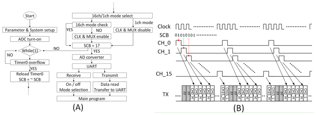 Figure 7(A) shows the control flow of the MCU, and detailed timing chart of the data is in Figure 7(B). The microsystem provides two operation modes, namely 16-channel mode and single channel mode. In the case of 16-channel mode, the clock signal generated by the MCU is sent to the AFE amplifier to scan the 16 channels and output the series data. A counter controlled Sample-control-Bit (SCB) is used to sample the analog data to ADC at the falling edge of the clock. Digitalized 12-bit data is then divided into first 8-bit and later 4-bit (2 bytes) because the UART only transfers 8-bit data in one time. After 16 channels are sent, two FF which acts marker are sent into UART before next 16-channel data. The marker is used by the software to divide and reconstruct the serial data back to simultaneous 16 channels. Windows-based software is designed for receiving data from the presented microsystem and sends commands to turn on, reset or parameter setting to the microsystem.