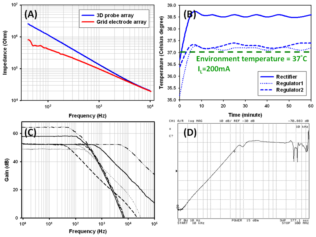 Impedance spectroscopy was used to evaluate the impedance performance of the electrode- tissue interface. When the electrode sites come into contact with tissue, electrode-tissue interface impedance was established. High interface impedance will cause signal attenuation and induce considerable thermal noise while recording. Figure 8(A) displays the impedance spectrum of the grid electrode and 3-dimensional probe array in physiological saline solution, which is used to simulate the recording conditions. Result shows about 10 kΩ impedance at 1 kHz. The grid electrodes have lower impedance due to the larger electrode area.