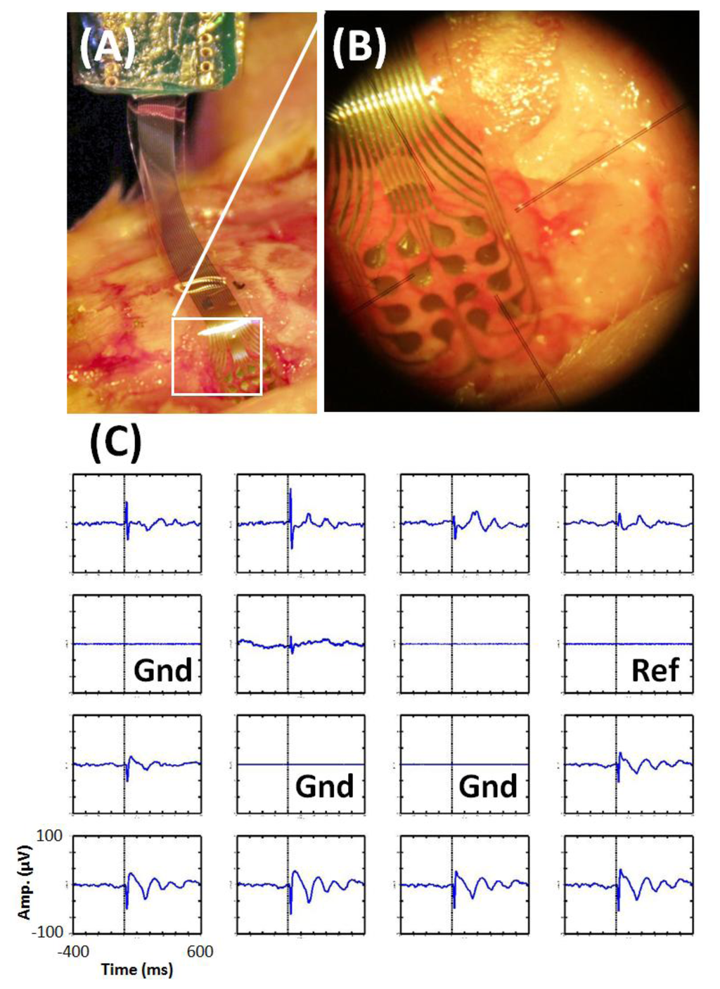 To demonstrate the functionality of the fabricated gird electrode array, in vivo experiments on auditory stimulation response recording are induced. When an anesthetized rat receives specialized frequency/magnitude sound stimulation, an electrical response can be observed on a localized auditory area of the cortex. When the sound stimulation is received by the ears, it is transformed into neural signals and sent into brain which causes neural activities appearing in the auditory sensory area. By using the flexible grid electrode array, the area of interest of the brain is covered and recorded. Therefore, a localized electrical response spot could be detected and characterized for functional mapping and event evaluation. Practical implantation optical photograph is presented in Figure 9(A), which shows how the flexibility of the system allows excellent fitting to the exposed brain cortex. Figure 9(B) shows the close-up view of the electrode array contact area.
