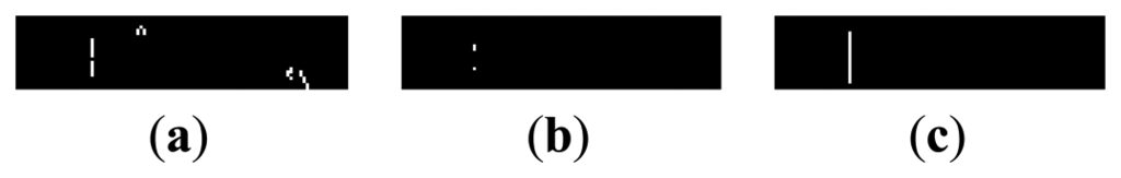 Mathematical morphology is established based on set theory, and can be applied to remove noise from the image. Basic morphology operation includes erosion and dilation. After binarization, defect area and noisy points are white with a pixel value of 255, while other points are black with a pixel value of 0. The traditional morphology template is shown in Figure 11, and 5 × 5 is used for example. The vacant point is the center of template and its value is 255. Only if all the 24 adjacent pixels have the same value as this pixel, then this pixel is set to 255. Otherwise, the pixel value is set to 0. Because defects on warp knitting machine are mostly linear, erosion with traditional n × n template might erase the defect area as well. Thus, we chose the 5 × 1 vertical template to remove the noise, as shown in Figure 12. Only if the top 2 and bottom 2 pixels are 255, then the vacant pixel is set to 255. According to the experiments, the 5 × 1 template performed well on removing noise. After removing noisy points by erosion, dilation is used to obtain the final defect area. After two dilating operations on eroded images, the discontinuous defect parts are connected, and the results are shown in Figure 13.