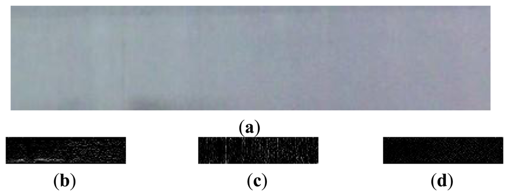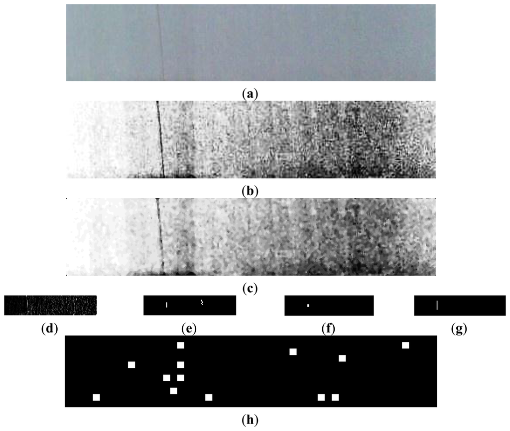 In this section, the experimental results are presented to evaluate the performance of the proposed detection algorithm. The evaluation environment is MATLAB 7.0 and Windows XP was used on a PC. Figure 14(a) shows the test picture with resolution of 424 × 88 cropped from an image captured by the smart visual sensor. There is a very thin linear anomaly embedded in the fabric texture. According to the detection flow of Figure 6, the intermediate and final results are shown in Figure 14(b–g). LBP is another popular method to detect fabric detects. Figure 14(h) is the detection result using LBP [13,14]. It is obvious that LBP couldn't locate the defects accurately. Experimental results show that the proposed method outperforms the LBP algorithm in detecting the defects on the warp knitting machine. The common defects of warp knitting machines include lines and hole defects caused by broken warps. We only give the experimental results of line defects in Figure 14 since detection of hole defects is easier. The most time-consuming step is wavelet transform. But we only perform 2-level decomposition and the wavelet reconstruction is not needed, so the computational complexity is acceptable and reasonable.