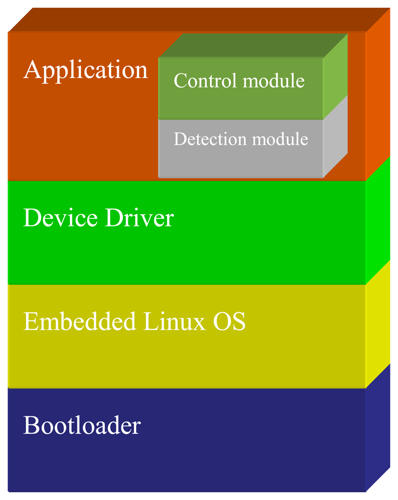 BF537 runs on uClinux OS, and the whole software architecture includes a bootloader, OS, drivers, and application, as shown in Figure 5. The application software is the core part of this architecture, and its work flow mainly contains the following: firstly, original image data are captured from the PPI driver. Secondly, the image data are transmitted to the detection algorithm module for analysis. Finally, the control module commands relay how to operate according to the analysis result.