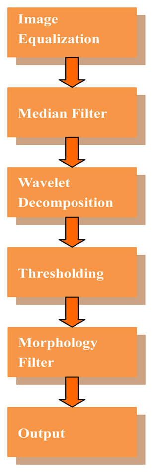 Two factors must be considered in choosing the detection algorithm, namely, efficiency and real-time. Among these algorithms, wavelet analysis is very sensitive to line defects and its computational complexity is low, and thus, we chose wavelet analysis as the basis of the detection algorithm. The typical defect on a warp knitting machine is the broken end, i.e., a line defect is caused by a broken warp. On a multi-bar warp knitting machine, the broken end defect caused by a single yarn is not easily seen, especially with the very thin yarn such as 20 D (indicates the weight of 9,000 m of long yarn is 20 grams). Therefore, this kind of defect detection is challenging. To improve detection rate, we propose an improved direct thresholding method on wavelet high frequency coefficients instead of a reconstructed image. In addition, a proper template of mathematic morphology filter is chosen to remove noise, and retain the defect area. The flow chart of our detection algorithm is shown in Figure 6.