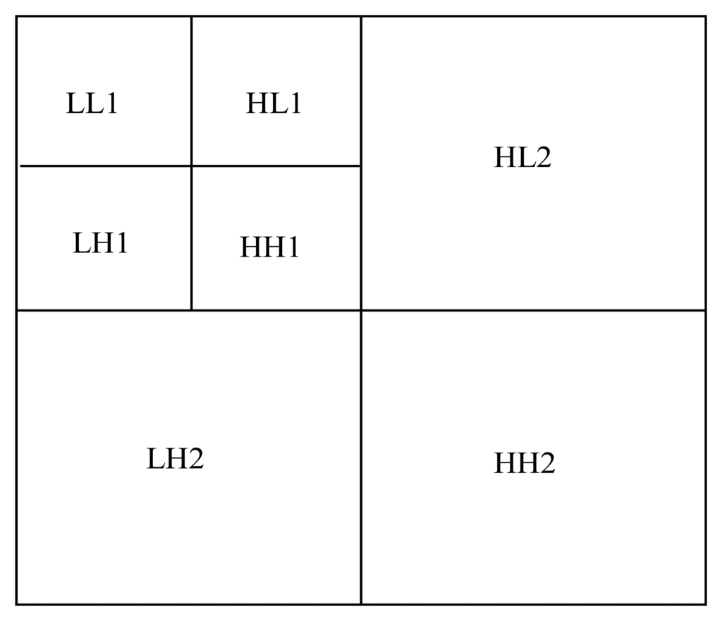 The image is decomposed into multiple sub-bands by the wavelet transform. Each sub-band includes different information. The 2-level wavelet decomposition of image is shown in Figure 8. LL is the low frequency coefficient, which denotes the coarse features of the image. LH, HL, and HH are high frequency coefficients of vertical, horizontal, and diagonal directions respectively, which denote the detailed features of the image.