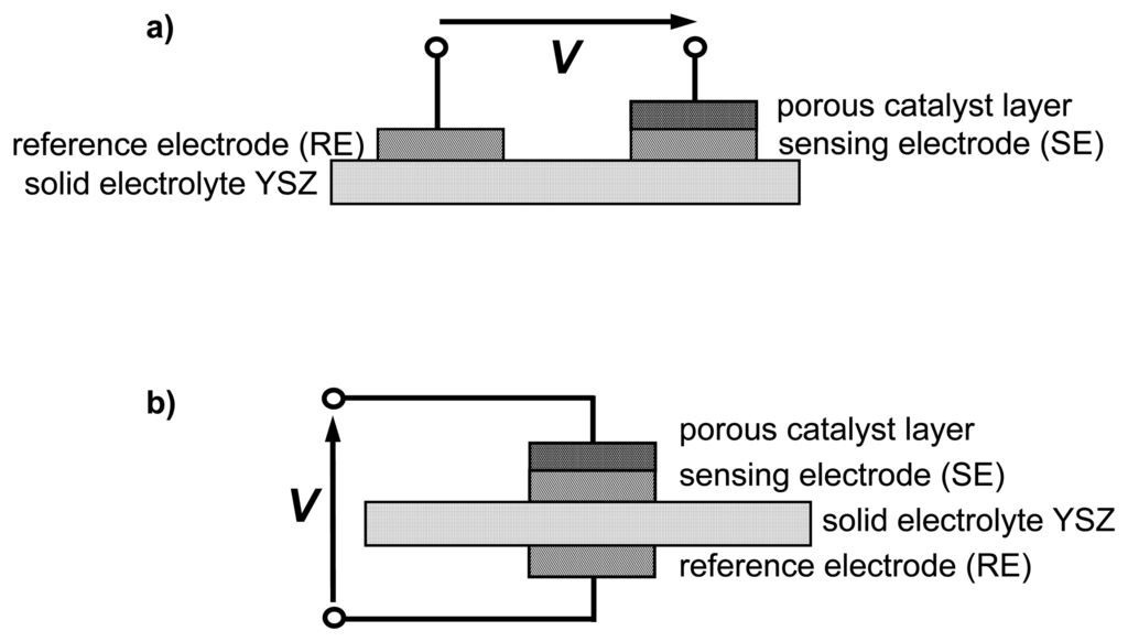 The introduction of selective catalytic reduction (SCR) systems for exhaust gas after-treatment of NOx-emissions of diesel-fueled vehicles requires novel sensors for control and On-Board Diagnosis (OBD) purposes. The reducing agent ammonia, injected into the exhaust pipe as an aqueous urea solution (AdBlue®), reacts at the SCR-catalyst with nitrogen oxides. Nitrogen and water are formed as reaction products [1,2]. The conversion efficiency of the catalyst is, besides parameters like temperature and catalyst composition, strongly dependent on the ratio of ammonia (NH3) to nitrogen oxides (NOx), which is adjusted by the amount of AdBlue-solution injected. Selective NOx-sensors or NH3-sensors would be appropriate to monitor these concentrations downstream of the SCR-catalyst. In Reference [2–4], the control of the AdBlue dosing system by an NH3 sensor is preferred. It allows the closed-loop control of the SCR-system and also the OBD of the SCR-catalyst. Different NH3 sensing principles have been investigated for that purpose [5]. Solid electrolyte-based sensors with optimized electrode materials and configurations seem most promising. Sensors based on yttria-stabilized zirconia (YSZ) electrolyte have been studied extensively in the past years for exhaust gas applications. A robust sensor element yielding fast response, high selectivity and sensitivity, and a long-term stable sensor response is required. Besides well-known examples for high temperature applications in engine exhausts like lambda probes and amperometric NOx sensors, for the detection of exhaust components like CO, H2, HC, or NOx, non-Nernstian mixed potential sensors are promising [6–14]. Mixed potential type sensors for NH3 detection are also under investigation by various groups [3,15,16]. Different material compositions have been screened for their applicability as sensing electrodes. For that purpose, a threefold functionality of the sensing electrode including electrical conductivity, electro-catalytic activity, and selectivity is required. Besides, long-term stability and adjusted catalytic properties are necessary. For a sufficient sensor performance, including high sensitivity, selectivity, and reliability, the sensing electrode materials need to be optimized. Very often complex material compositions, e.g., semiconducting metal oxide mixtures with additional dopants for stabilization purposes are suggested [16].