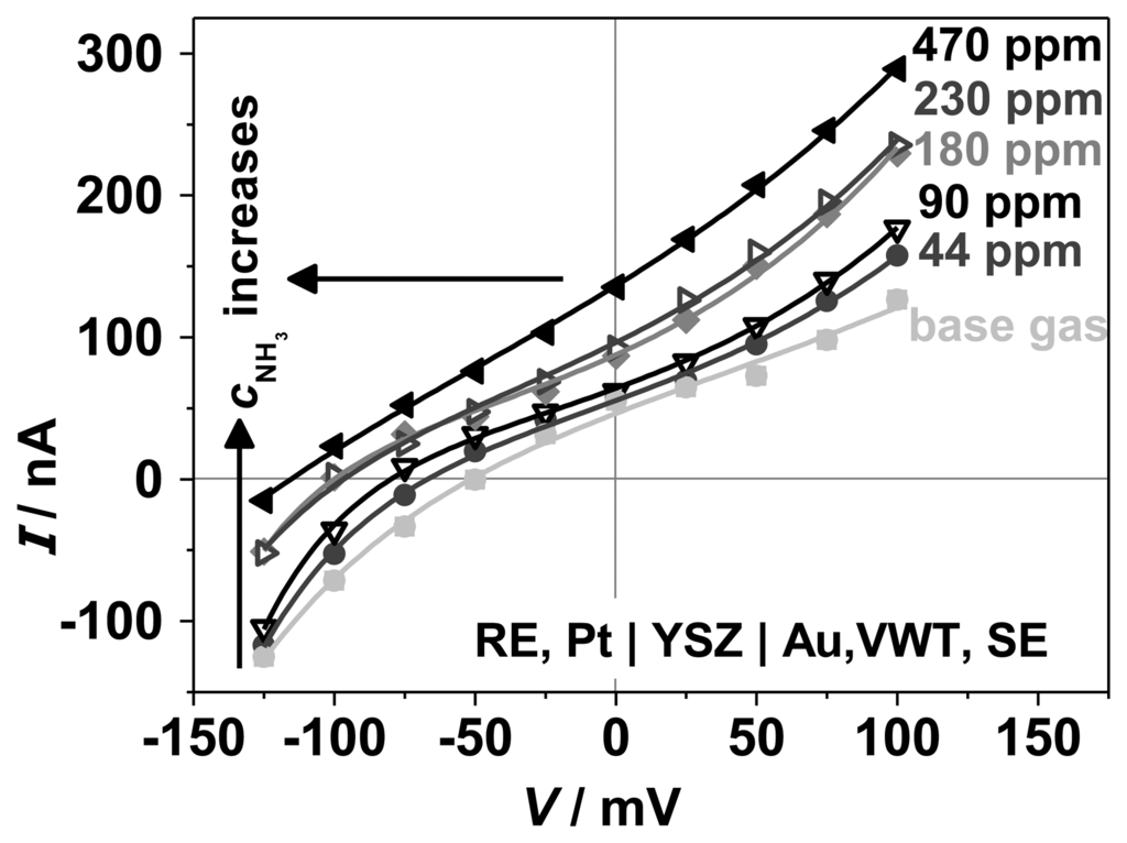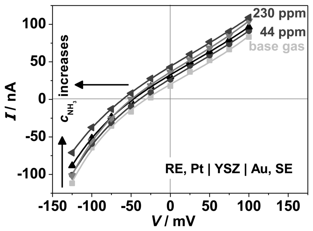 A voltage from −125 to 100 mV (25 mV steps, 300 s each) was applied to the SE and the resulting current between SE and RE was measured. Figure 10 shows the NH3 dependency of the I-V-curves of the cell Au | YSZ. The electrode potential, V0, corresponding to the voltage at a current of 0 nA, shifts with increasing ammonia concentration to more negative potentials. In base gas, a V0 ≈ −25 mV can be determined, whereas with 230 ppm NH3 a value of − 60 mV occurs. The shape of the curves remains unaffected by the ammonia concentration. At a fixed potential, i.e., in an amperometric operation mode, the current increases slightly with increasing NH3 concentration. It is suggested that more charge can be transferred due to generated electrons during the electrochemical NH3 oxidation (Equation (1)). However, one should notice here that the measured current is less than 100 nA, indicating that only a small current is generated by the electrochemical reactions.
