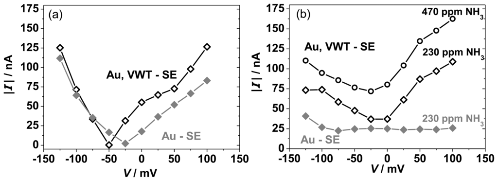 The modified polarization curves for the cathodic reaction in base gas (Figure 12(a)) for Au and VWT-covered Au electrodes behave almost similar. Only negligible differences are visible. It is assumed that the cathodic reaction is barely changed by the VWT cover. This agrees with the characteristics of the electrode potential presented in Figure 9. Again, it has to been noticed, that the current is very low (<100 nA), indicating that the reaction rate of the oxygen reduction is small and hardly proceeds at the three-phase boundaries of both half-cells. In contrast, the anodic polarization curves illustrated in Figure 12(b) behave differently. The current generated by the anodic NH3 oxidation on the pure Au electrode is almost constant (25 nA) over the investigated potential range. The VWT-covered Au electrode provides a higher current, but the current is still in the nA-range. The difference in the modified anodic polarization curves indicates that the VWT cover of the Au electrode enhances the anodic NH3 reaction, whereas the cathodic O2 reaction is only marginally influenced by the VWT layer. With increasing NH3 concentration, a higher current can be observed, i.e., more ammonia can be oxidized in the anodic reaction.