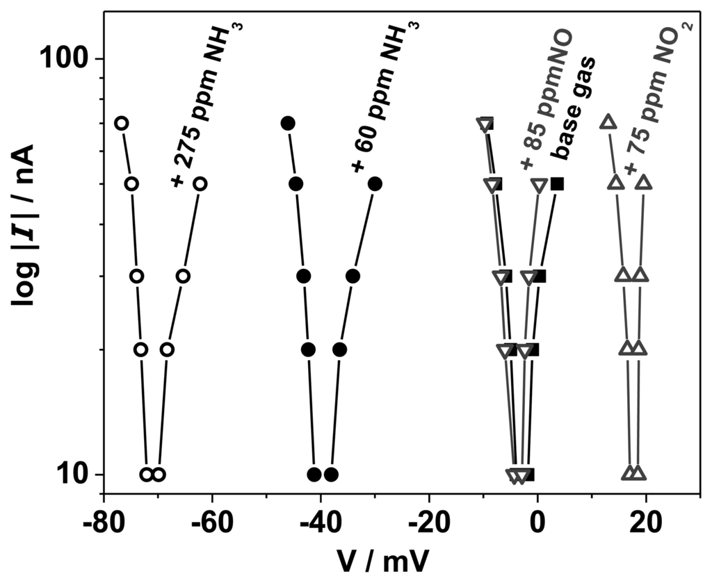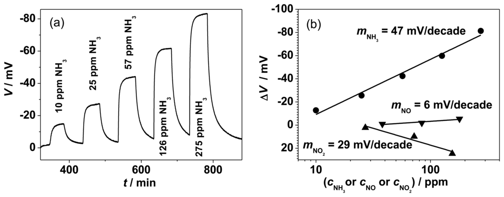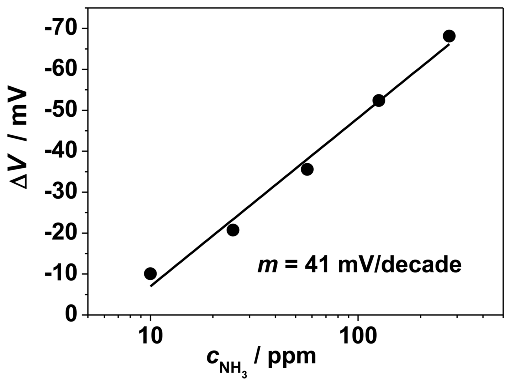 In order to quantify the NH3 sensitivity, the steady state values, ΔV = VNH3 − V0, are plotted versus the logarithm of the NH3 concentration (Figure 5(b)). Please note: due to the definition that follows the standards in electrochemistry, both ΔV and V have a negative sign for oxidation reactions of NH3 and NO and a positive sign for the reduction of NO2. In order to be coherent with the point of view of sensor developers, they are plotted reversely. In the following we will use the expression “increase” meaning the absolute value of V and ΔV.