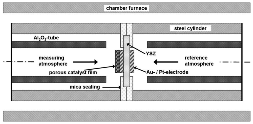 The setup for half-cell measurements is illustrated in Figure 2. Main parts of the half-cell setup were two stainless steel cylinders, each with a gas inlet and outlet and joined together by a mica seal. Both gas atmospheres were separated gas tightly by the mica seal and the half-cell probe itself, so that both electrodes could be exposed to different gas compositions. The RE was in contact with the reference gas atmosphere whereas the SE was exposed to the measuring gas. Platinum wires were used as contact leads. The entire half-cell setup was mounted into a chamber furnace which was heated up to operation temperature. The temperature at the half-cell probe was monitored and adjusted to 550 °C by two thermocouples (not shown in Figure 2). A temperature gradient of 5 K at the maximum was observed across the half-cell specimens.