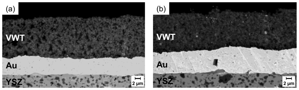 Sample morphologies and layer thicknesses were analyzed by a scanning electron microscope LEO1450 VP (Zeiss). Figure 3 shows SEM images of cross sections of the sensor-like setup (Figure 3(a)) and the half-cell probe (Figure 3(b)). The gold electrodes have thicknesses of about 6 μm (sensor-like setup) and 8 μm (half-cell probe). Morphology and porosity of both Au electrodes are almost equal. The low roughness of the YSZ substrate can also be seen. According to [25,26] this leads to a small interface between YSZ and Au electrode. The VWT catalyst layers on top of the Au electrodes show a thickness of about 13 to 15 μm and the grain size is less than 1 μm. The images confirm the porosity of the catalyst film. The catalyst properties of both samples appear almost equal.