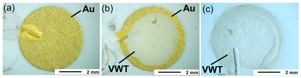 To investigate the effect of the VWT thick film on the electrochemical activity more in detail, the coverage degree of the Au electrode with the VWT catalyst layer was varied. As a first experiment, one half-cell probe Au | YSZ | Au was measured to analyze the electrochemical activity of the pure Au electrode. The same specimen was afterwards partially covered with the VWT catalyst layer. After the electrode potential dependence on the ammonia concentration was determined, the electrode was completely covered with VWT. Again, the electrode potentials were determined on the same half-cell probe. The VWT-coverage degree of the Au electrode can be obtained from the light optical microscope images in Figure 6. Figure 6(a) shows the uncoated pure Au electrode, Figure 6(b) the partially VWT-coated electrode, and Figure 6(c) shows the completely coated one. Here, Pt was used as the material for the RE on the opposite side.
