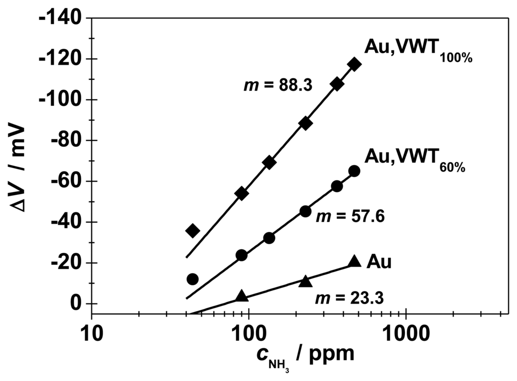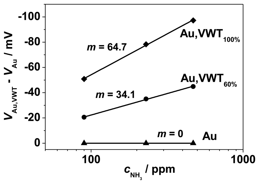 In base gas atmosphere, with 0 ppm NH3, the effect of the VWT-coverage can be neglected. At a VWT coverage degree of 60%, a sensitivity of 57 mV/decade NH3 is obtained, whereas with 100% coverage, 88 mV/decade NH3 are reached. The NH3-sensitivity m increases clearly with the VWT coverage degree of the Au-electrode.