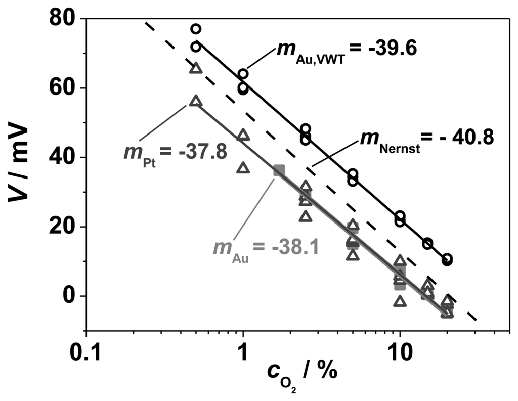 In addition, when comparing the slopes of two half-cell measurements of the VWT-covered Au-electrode with different half-cell probes (47 mV/decade (Figure 5) and 88 mV/decade (Figure 7 Au, VWT100%)) a huge discrepancy is noticeable. These differences are a further hint of a non-Nernstian sensor behavior, because in case of equilibrium sensors the slopes should be equal for each sample. Here, it has to been noted that the experiments are tested with different samples and as known for mixed-potential sensor devices the scattering from sample to sample is a serious issue. As a consequence with respect to equal test conditions, the difference in the slopes can only be ascribed to fluctuations between actually similar samples (like differences in morphology, electrode and catalyst thicknesses, and interfaces YSZ | electrodes).