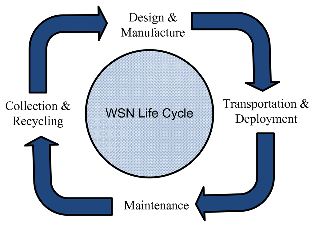A large portion of green house gases is composed of carbon dioxide (CO2) emissions. For WSN, the term green refers to an energy-efficient and a low carbon deployment and operation. For reducing green house gases, particularly carbon dioxide emissions, an energy-efficient resource allocation plays a significant role and has a direct impact on the lifecycle of WSN. The lifecycle of WSN is shown in Figure 1. WSN are composed of the following phases: sensor network design, manufacturing, transportation, deployment and recycling. Each phase has its role in global warming—e.g., sensor network design and the manufacturing phase require highly sophisticated computing machines that not only use ample amounts of electricity, but also produce electronic waste. Both the generation of electricity and electronic waste has a direct impact on global warming. The sensor network application, e.g., multiple tracking, traffic monitoring, spectrum sensing or any other commercial/military application, requires a dense deployment of sensors. In the deployment, maintenance and recycling phases, the use of transportation is the major source of global warming.
